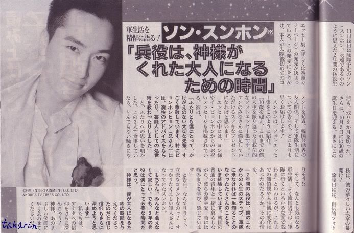 另外,怎么也让人牵挂的军队生活.经常有说韩国男子“去了军队就会在各方面改变”,迄今的价值观和人生观有了变化吧.对那种心情作了如此告白「2年的兵役是我以后人生的阶段.现在经历著一生中不来军队就无法了解的许多事.同韩国普通的青年一起生活,学习和感受著他们的梦想、爱~   有时甚至是痛苦.」