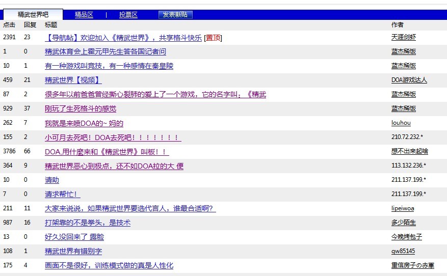 今天在贴吧看到精武世界的人在骂我们,我怒了,我去精武世界贴吧看了下,最醒目的位置写着《DOA你用什么来跟精武世界叫板》这刺痛了哥的眼睛