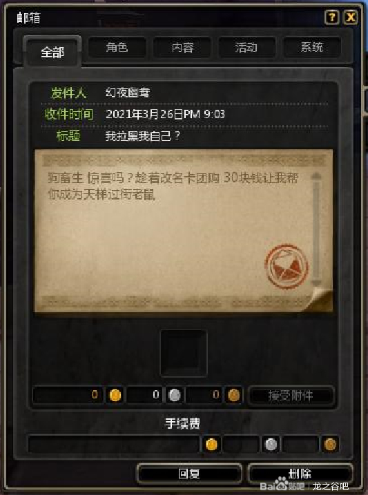 pvp一步一步打上来的人都知道,总会有几个打不过你还很气的人看你不对眼,那时候我才网通1800分左右,菜得很。我没理他,截图是想等他骂够半年,我就报警网络暴力,看看能不能祝我上次热搜。这集火不定时还会发一封邮件给我,内容也不过就是骂骂咧咧。