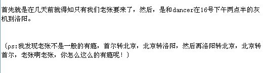 但是因为我们公司周五下午三点才下班,于是乎,我的接机梦想就这样的破灭了。刚下班我就窜酒店了,因为我们公司距离他们下榻的酒店不是一般的近,但是我到的时候是三点多一点,但是,酒店门口和酒店大厅没有一个人,我当时就觉得老张应该是换酒店了。于是,我杯具的走了,然后最后杯具的知道大概就是我刚走,他们车就是大概那个时候到的,我如此杯具。