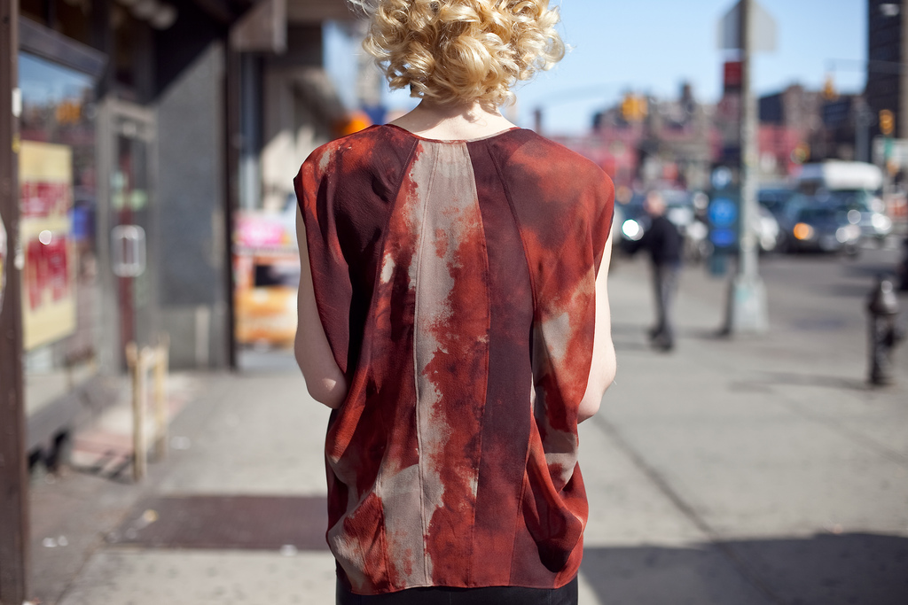 In the first photo, Celia is wearing a red chiffon top inspired by Belgian performance artist Merlin Spie's "La petite musette, casquée (2002)" In that image above, the person is facing a wall and breathing with the assistance of special diving head gear; yet, she has a cigarette in her right hand. It all symbolizes the passing of time. Michael mentioned how images like this help him recognize his mortality and inspire him to live and embrace life to the fullest. The seams on the back bring the eye in and the nude colors help soften the profoundness of the variant hues of reds. It's instances like these, where you get to sit with the designers, that you are filled with a passion and reverence for their art.