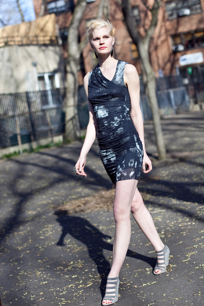 The Skull Print dress actually obtains it's initial inspiration from X-rays and pictures from various medical journals. The result is an abstract collage, fine tuned to add a special color element that breaks the color down. It's not black, it's not white, and it doesn't have strips of colors either. The textured shades of grey (or red in the Inferno Print) result in a distinctive mood that's enhanced by the softness of the fabric it's made out of. Instead of being straight down, there are gatherings of fabric around the waistline, draping the body in beautiful curves where curves are wanted. It's made out of 2 light layers, the inner layer holding the outer layer's gatherings in place.