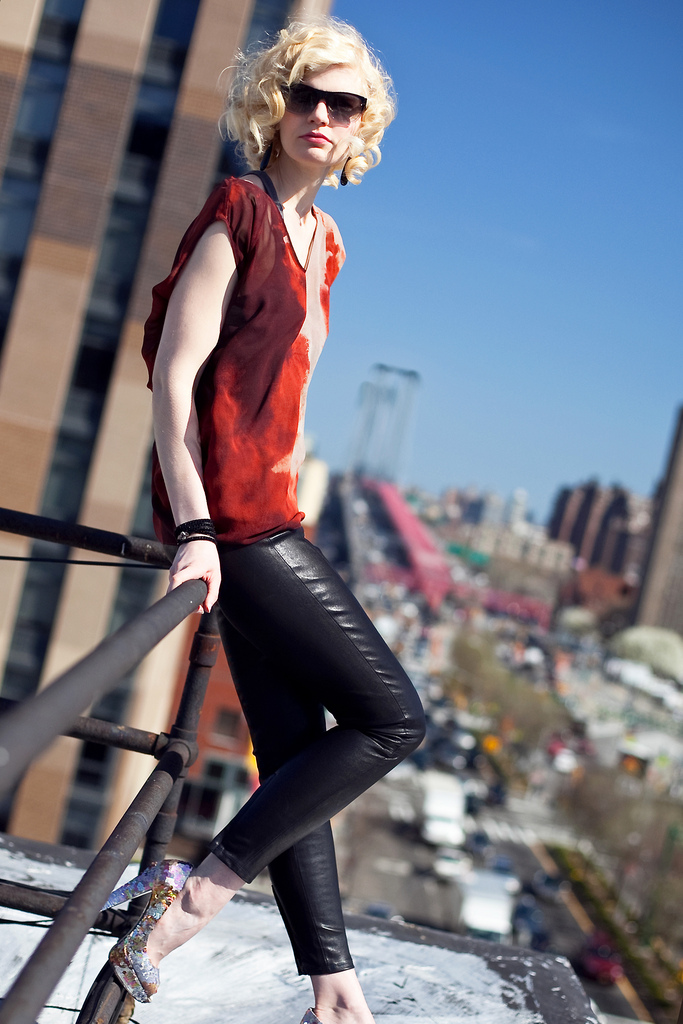 You also see that Celia is wearing the cropped "strech leather leggings". The seams on these were designed to "bring the eye in" with their "sinewy" and "architectural" weaves. They have some really cool zippers in the back too right above the ankles. I imagine you could have some fun playing with those. Some models I've talked that were wearing Helmut Lang mentioned how comfortable the strech leather pants were, an express goal of the Coloveses when they designed them.