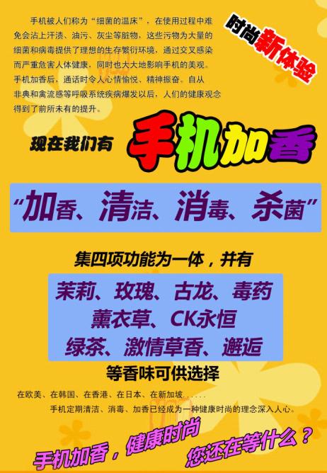手机加香:利用引进的纳米香精进行整机熏香和表面精密固化,使其缓慢释放香精分子,释放过程长30--60天,达到长时间留香的目的。