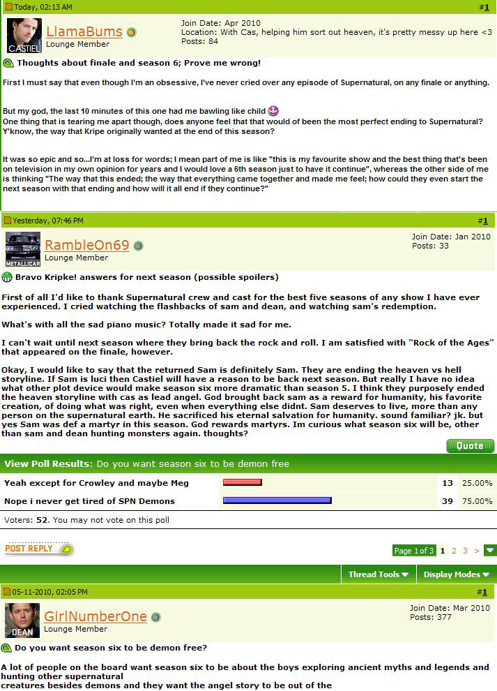 至于洋妞们的帖子应该就不用翻译了吧,大致都是致敬S5和期待S6还有夸奖制作人Kripke的意思,有耐心的筒子可以继续去挖挖看有准确消息没~~~
