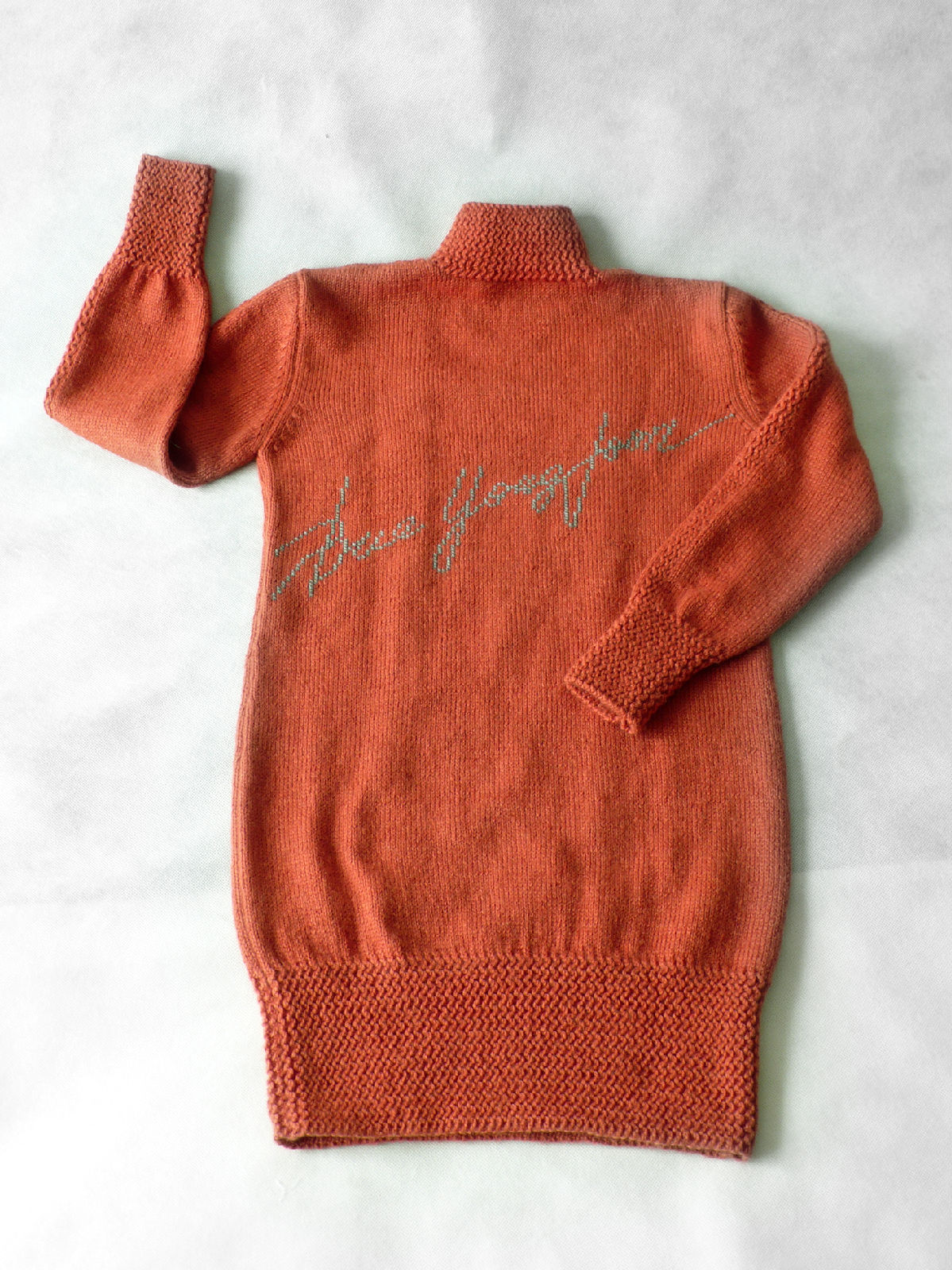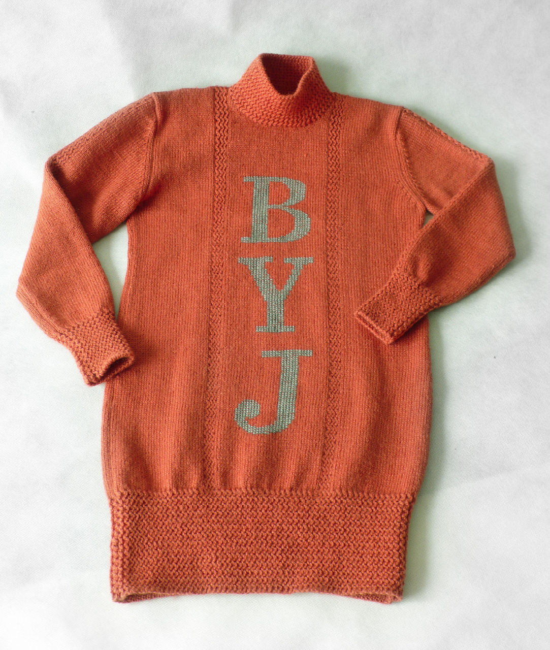 经过一个多月不懈努力,我终于完成了前后身都有勇俊英文名字的长款毛衣。整个制作过程充满了艰辛和乐趣,有句话特别能表达我当时的心情,叫做“痛并快乐着”。现在看着手中的这件毛衣感觉自已的功夫好像没有白花。
