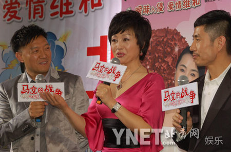 王姬以一袭低胸粉色丝质连衣裙亮相,性感又不失优雅。由于另一主演姜宏波与片方有些沟通不畅,因此并未出现在首映仪式,两位男主演只好与布景板合影。