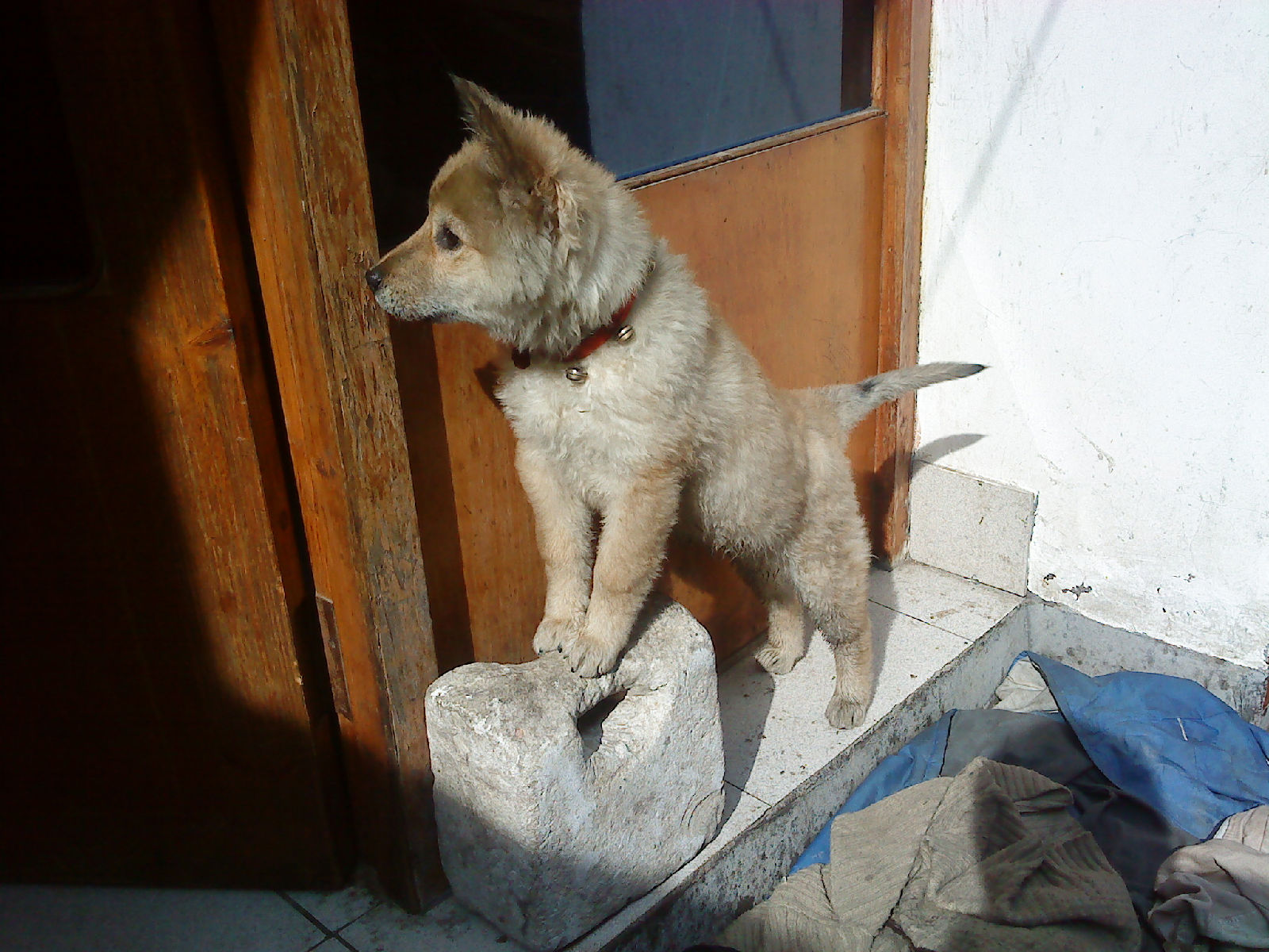 它叫欢欢,,是一只串了种的小土狗。。。又肥又笨。。。见谁都会摇尾巴。。。标志性的动作就是扭着屁股摇尾巴。。。。