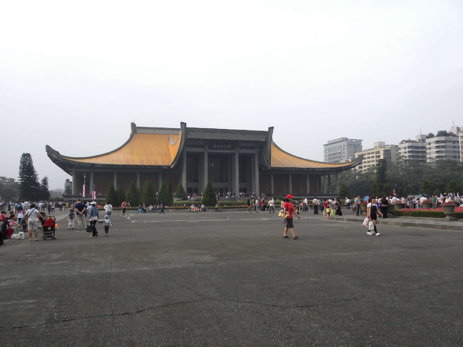 国父父纪念馆:位于台北市仁爱路四段,介于忠孝东路、仁爱路、光复南路与逸仙路之间,于1953年筹建,落成于1961年5月,是为纪念孙中山先生百年诞辰而兴建。馆高30.4公尺、每边长100公尺、每边由14支灰色大柱,以黄色屋顶采顶起翘角像大鹏展翼的形状,全部面积共35000坪,为仿中国宫殿式建筑,巍峨雄伟。馆外有中山公园环绕,还有九曲桥、池塘、假山、柳树等景色点缀。