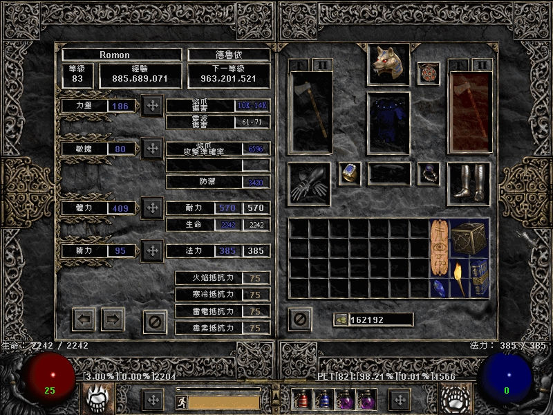 炎爪熊这种元素武学练法,其实一般是很不靠谱的……原因就在于物理攻击和法术攻击的不可兼得。物理攻击要考虑伤害、准确率、攻速缺一不可,而法术攻击要考虑技能、FCR、减抗。此外生命防御格挡抗性这些数值也要保证。FCR在这里可以无视,无论是炎爪还是有延迟的火系技能都不需要(尴尬的是最后我配出来的人物FCR还是挺高的)。准确率问题可以靠祝福瞄准型佣兵解决。关键就在于物理和火焰伤害的取舍,到底是技能还是ED?