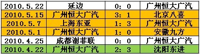 广州恒大广汽最近6场比赛结果(3胜2平1负)