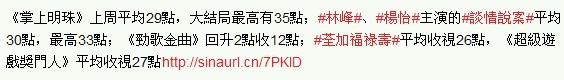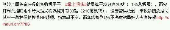 播映以来收视一直维持2字头的剧集《掌上明珠》,上周大结局篇终於突破3 字头收视,周一至周五平均30点,周六晚大结局平均33点,最高35点(逾223万)。