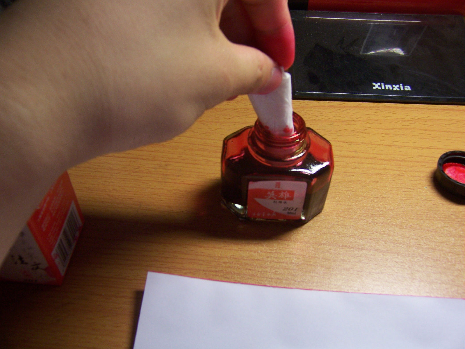 第一步,拿卫生纸团蘸红墨水,把纸像这样两面都染红,所以你直接用红纸也好。纸质不能太软或太硬,A4的就有点硬了。等到后面你就知道什么纸手感好,知道选什么样硬度的了。