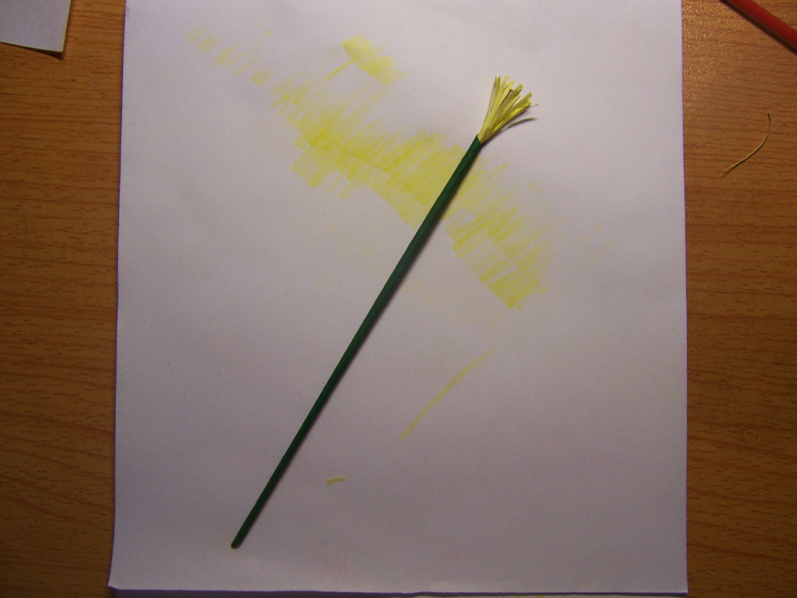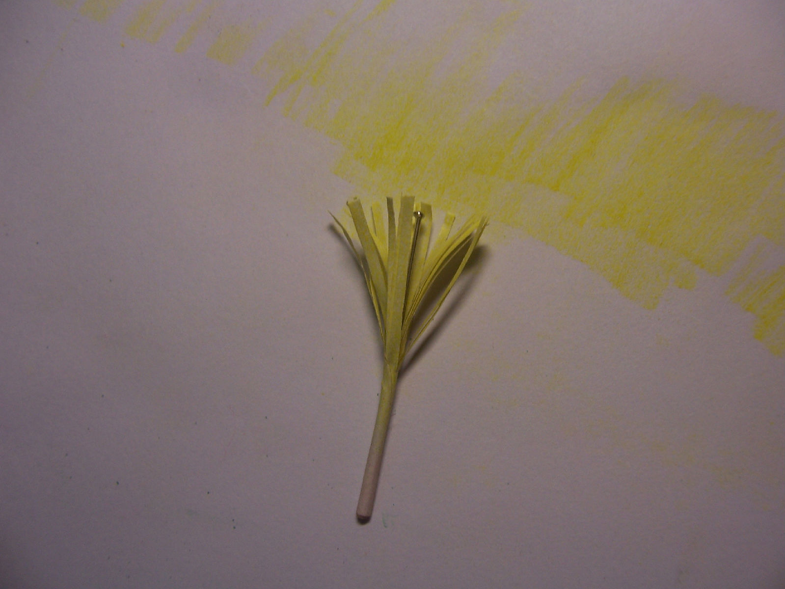 接下来是雄蕊的制作。还是要一小截白纸,然后用彩色铅笔在两面都把上部分涂色。用彩铅的理由是,看起来有光泽,而颜料没有。下半部分的一小部分没有颜色没关系,因为最后是插到花枝里去的。然后像这样剪出好多须,再卷起来,卷紧一点。像这样:
