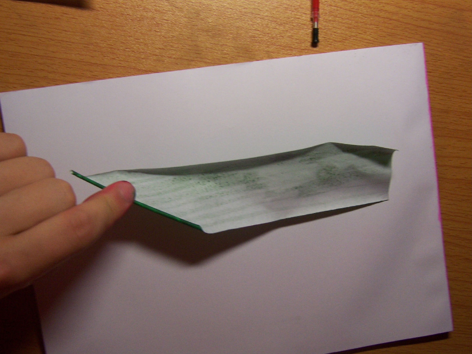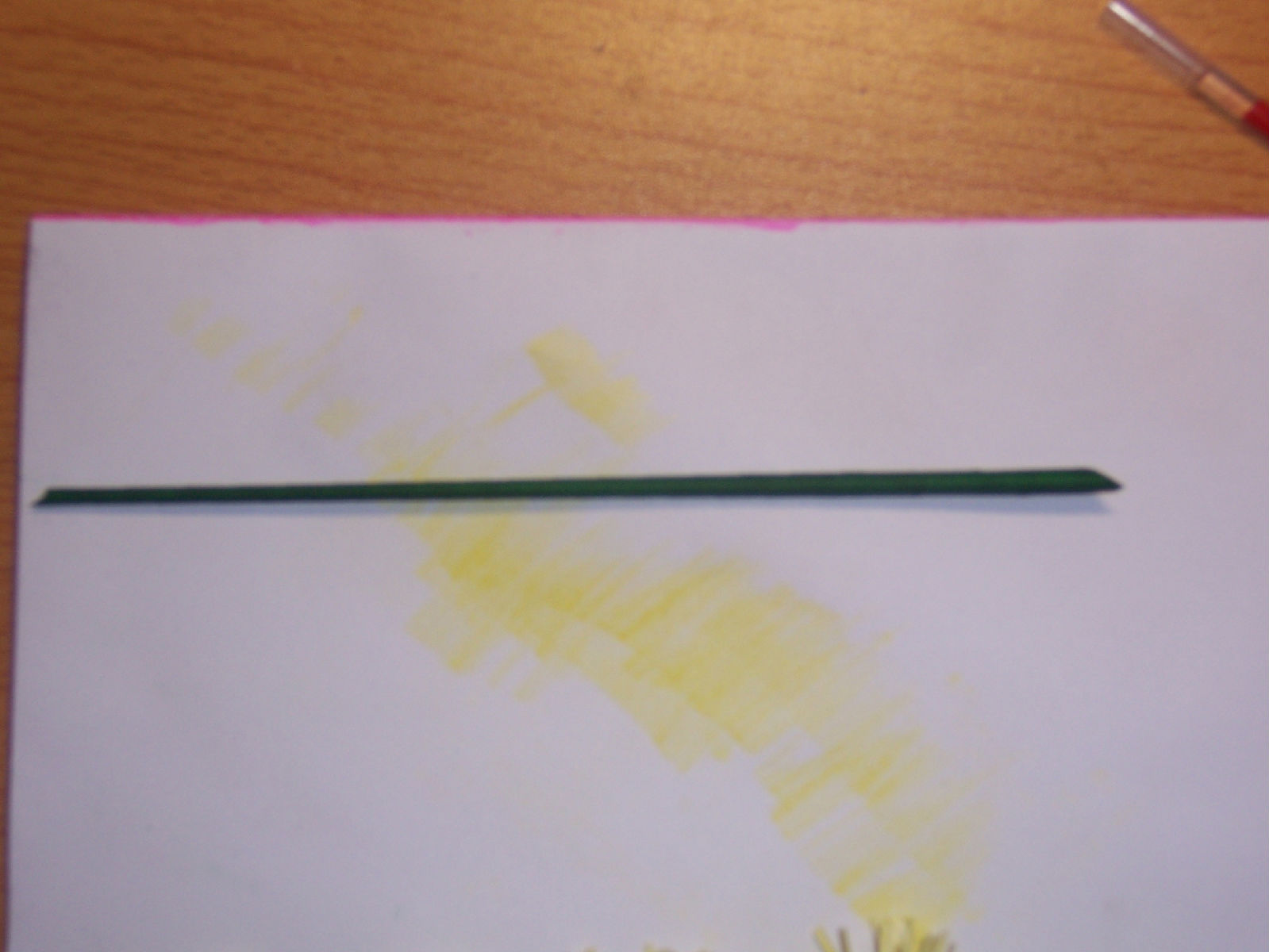 然后你先把它放一边,那是做花瓣用的,让它风干。接着就做花枝了,裁一截纸,一面涂上深绿,做时你就知道为什么只要涂一面了。然后像这样卷起来。再用胶棒粘上,用胶棒是因为粘得快,省时间。最后如果颜色不均匀的话,你可以在做好的枝上再涂一次颜料。
