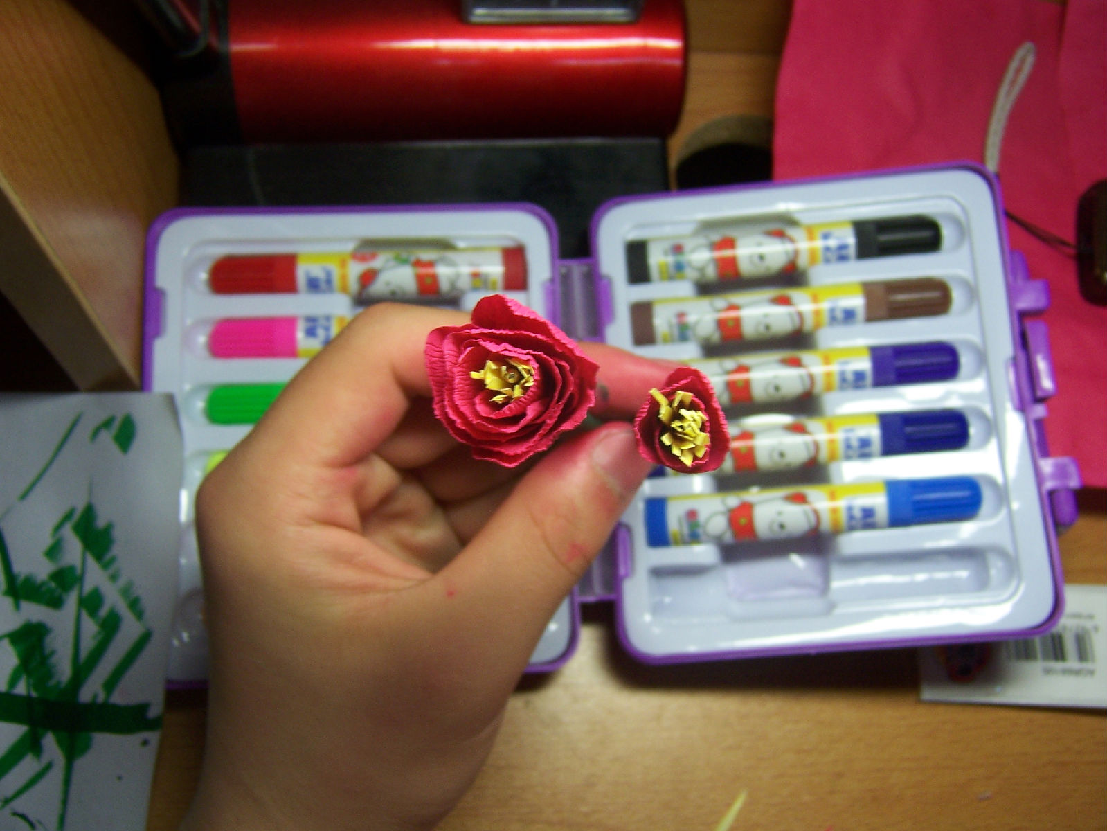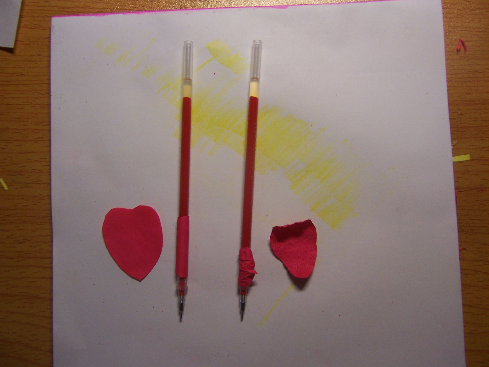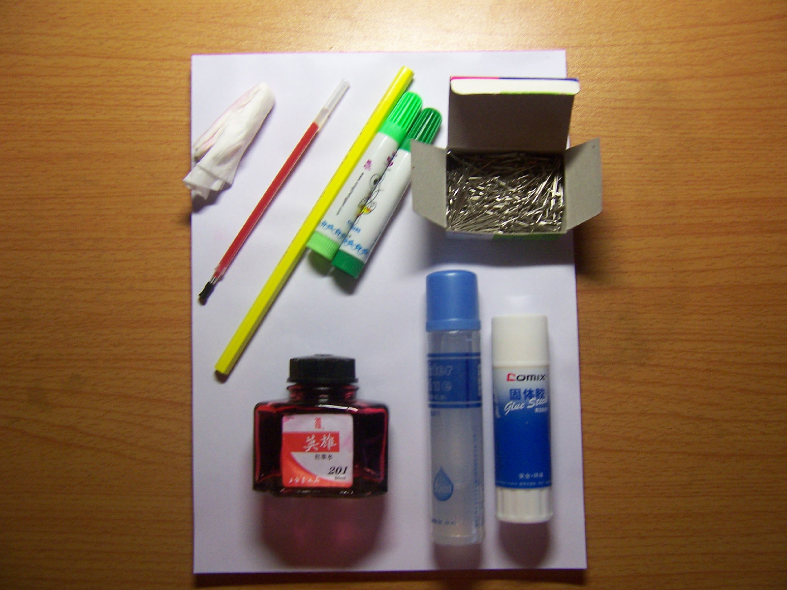 先上剧照。有白纸、卫生纸团、笔芯、黄色彩色铅笔、两种绿色水彩笔、大头针、红墨水、胶水和胶棒。剪刀忘记来拍照了。先别急买,有些东西可以替换,看完做法后再去买。