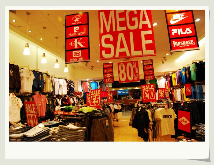 mega sale!(大甩卖)!英国的衣服真的很便宜,CK一条裤子才20镑,国内至少要1000块,阿玛尼的西服也在200—300镑左右,在国内没有一两万是买不到的,Levi's,Adidas什麽的到这里就是白菜价,一到换季价格更是便宜得离谱,呵,不要以为穿nike的就是有钱人,他一身上下全套装备可能不超过300RMB....
