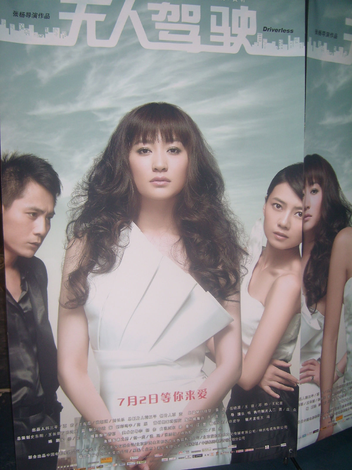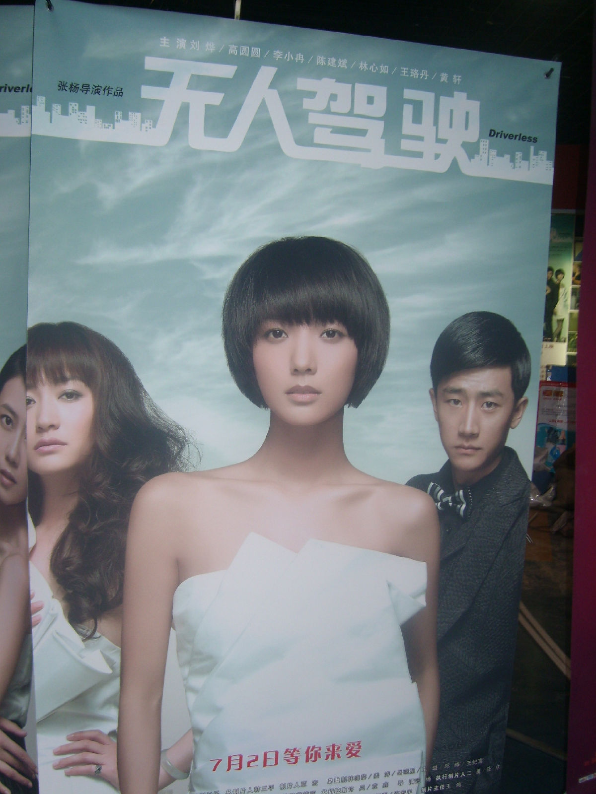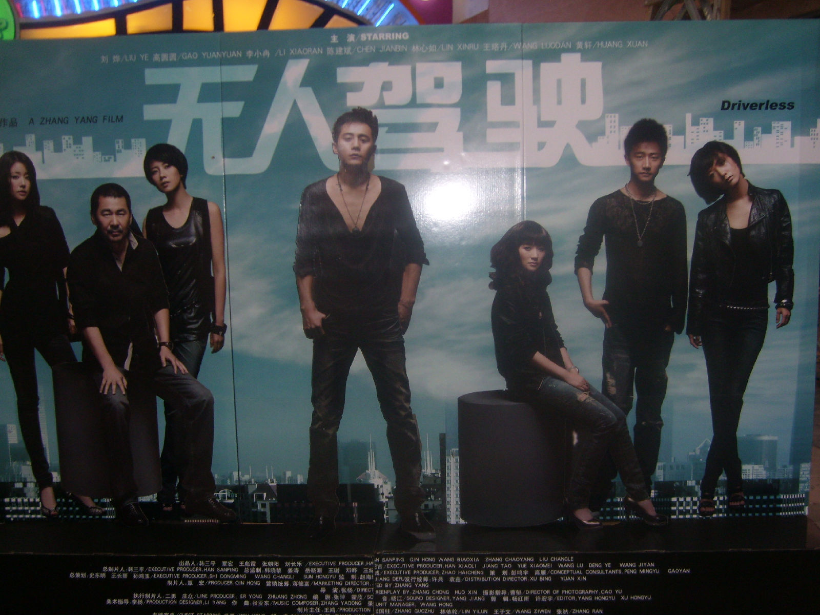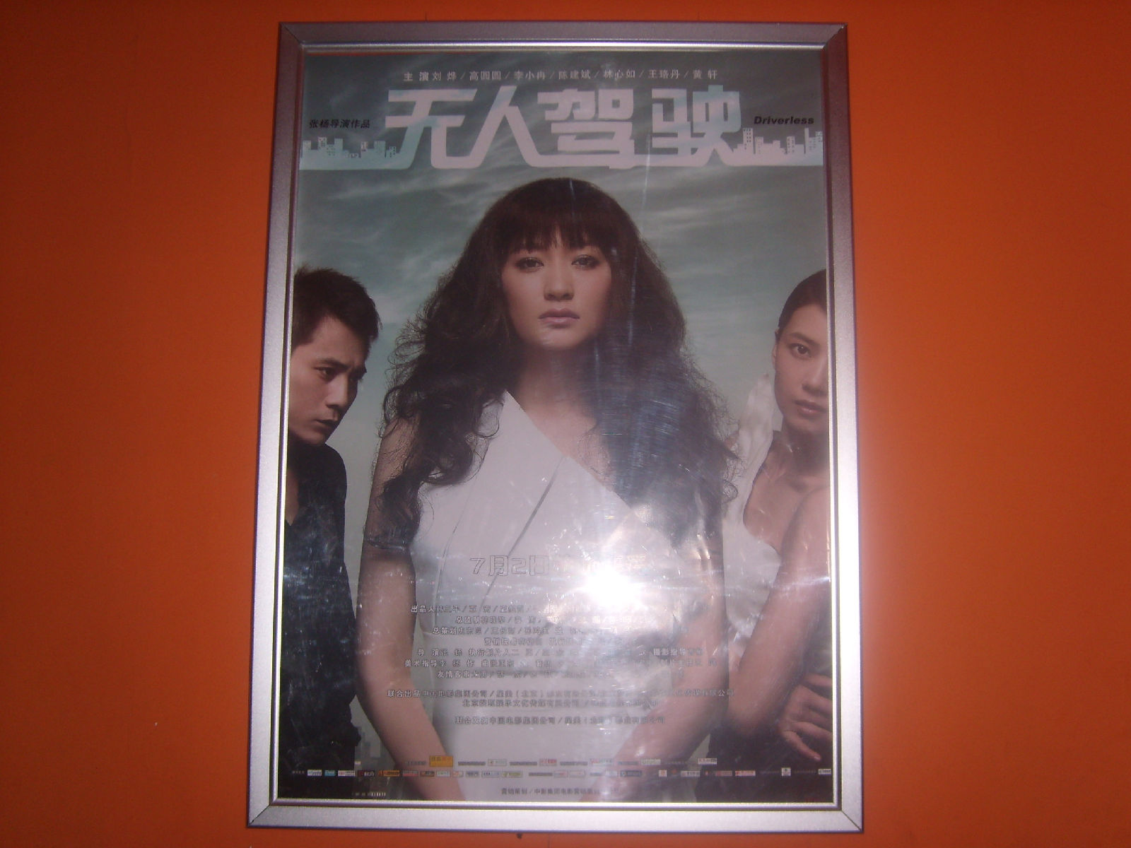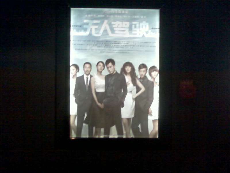 放映厅走廊上《无人驾驶》和冉姐单人的宣传海报 ,灯火昏暗拍的不甚清楚