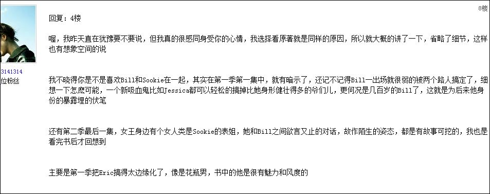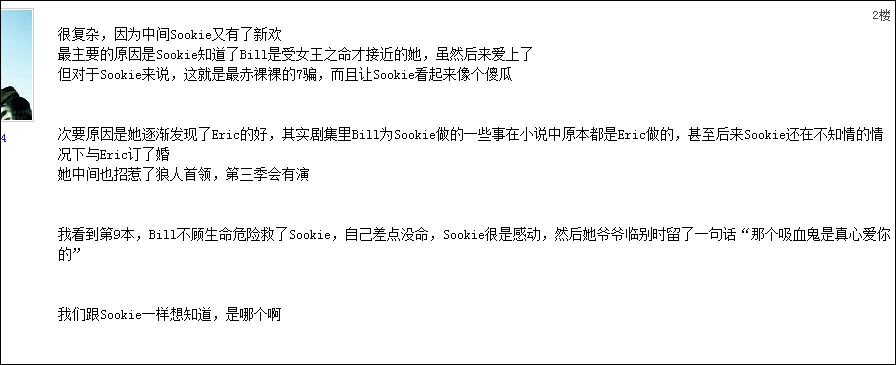 希望E早点和SK在一起.BILL做个吸血鬼不够坏,做人不够好.不象E既然是吸血鬼,就按吸血鬼的思维做,一样也可以帮助SK.