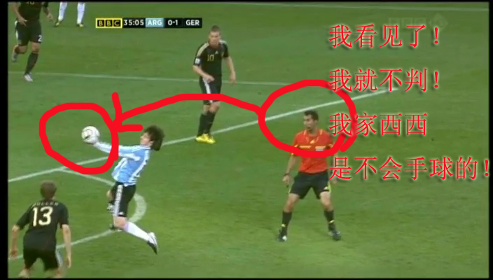 又想起来那天手球了…梅西小盆有…明明是你先双手接球…然后穆勒小受不小心碰到…这样就算了…可是你为什么要举报穆勒小受呢?穆勒小受…因为你的举报…被停赛…看到他在台下焦急的眼神…我就很心疼了…穆勒小受虽然被你举报了…可是他后来还是把你当偶像看的…梅西小盆友你这样做对吗?就像两个小朋友同时在上课的时候吃零食…这时候老师走过来发飙…反应快的就把吃的收起来…然后再举报自己的还在傻楞着的同桌……是啊…穆勒小受名气确实没有你的大…不过他还年轻…相信他有更好的未来的…德国输了就输了…不怪别人的…但是有的人…确实不该被捧的那么高…