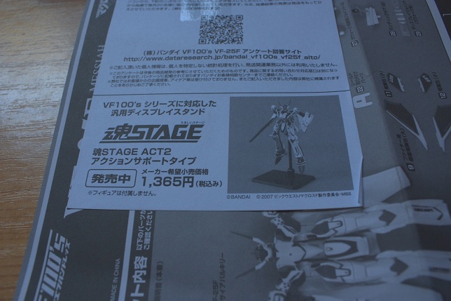 魂stage act2的支架,一千多日元。这在笔者看来是赤裸裸的打劫行为,更无奈的是我居然还就范了……魂stage的支架1365日元一套,一套有三幅,换句话说,你可以为了剩下的这两份支架,把另外两个VF100的VF-25也收了。