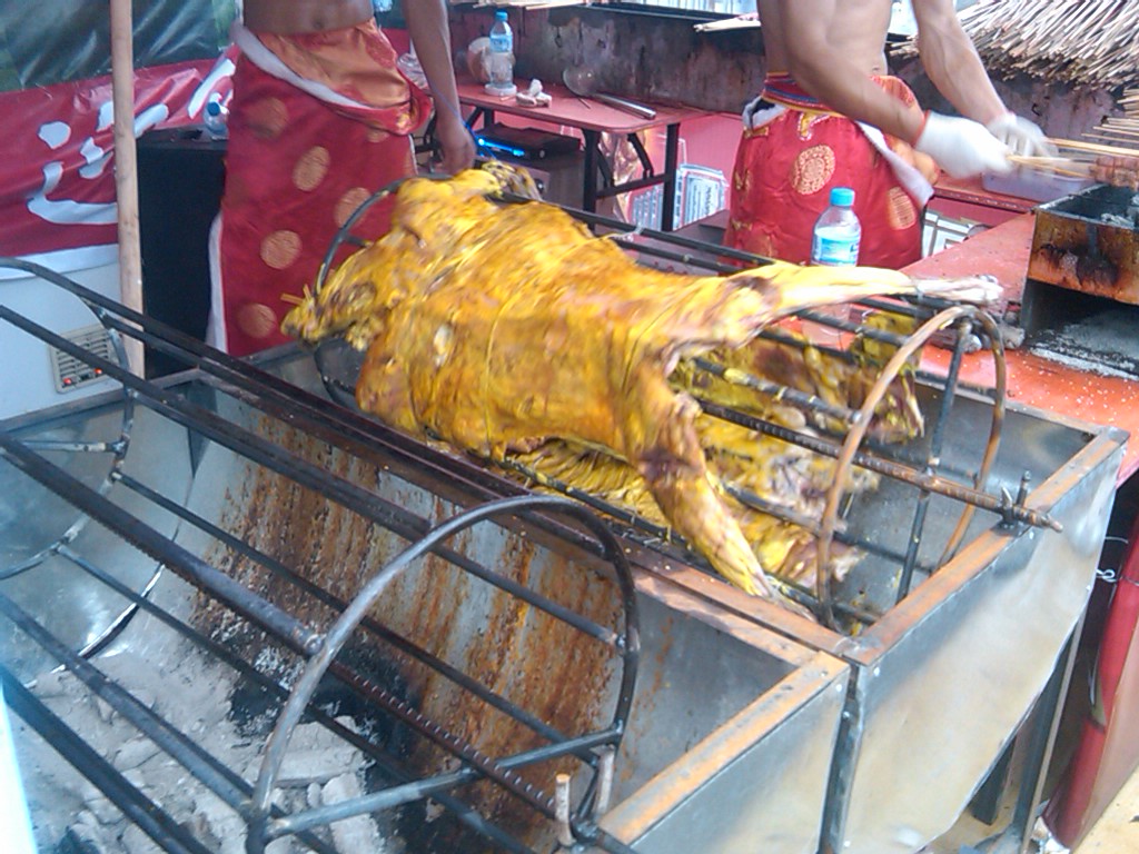 整个场地里弥漫着一股刺鼻的烟味,污染好大啊~ 各种烤肉,牛羊鸡猪鹿秋刀鱼乳鸽,油炸的螃蟹,五毒(蝎子,蜈蚣,蚕....) 臭豆腐,冷饮,最重要的还有百威啤酒~ 都瓶的,我还以为会有生啤呢!失望啊!
