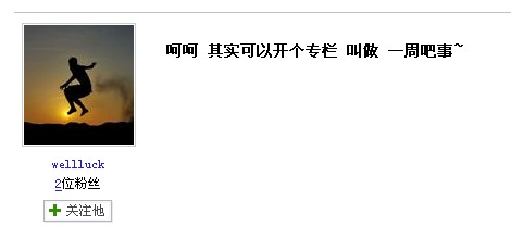 下面自我介绍一下: 其实很多同学还依稀记得在里仁学院贴吧里曾有过这样一个人,他不是管理员却每天任劳任怨、勤勤恳恳的在电脑面前按着F5刷新;他不是吧主却默默无闻地阅读每一篇帖子;他不是上帝却以自己的ID为各位吧友祈福……嗯~很多人都猜对了,他就是—— 里仁贴吧重量级刊物《吧事一周》编辑记者创始人、前里仁学院吧小吧主兼图片视频编辑、前里仁学院贴吧50个最具有影响力人物、前里仁学院贴吧发帖最强的前50强、前里仁学院吧大小号双料名人堂成员(wellluck and usbee),前里仁学院贴吧声望卓著的活动家,摄影家、评论家——wellluck