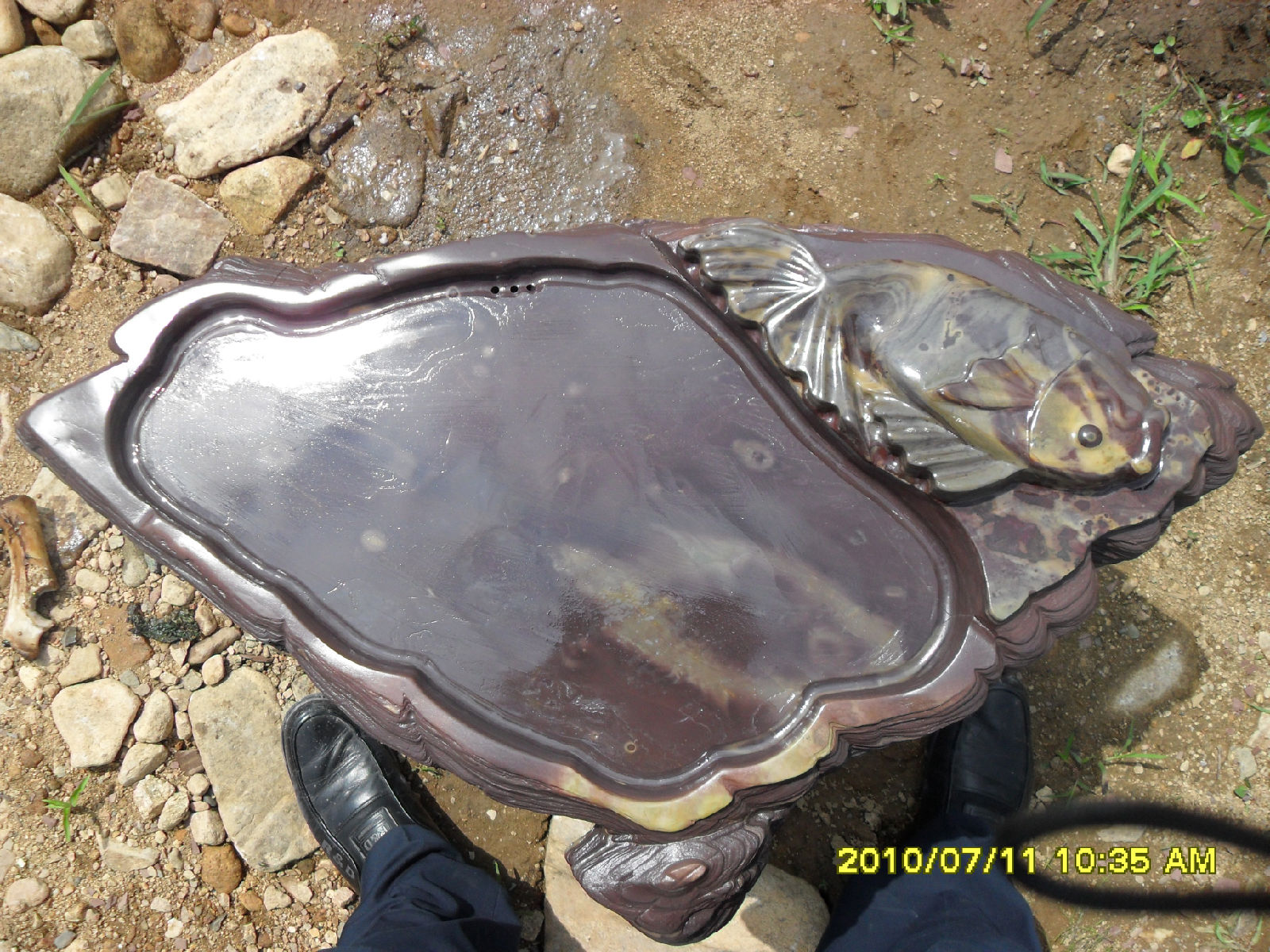 此茶海选用天然的随形石料加工,池中鱼影也是天然石料颜色形成.