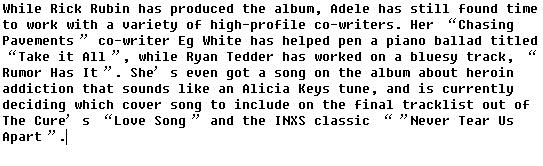 "有三、四首歌我很喜欢,会收到第二张专辑中,"年仅20岁的Adele说,"我又写了不少歌,所以在第二张专辑的制作过程中我哪里也不会去,我正在慢慢的寻找状态。"
