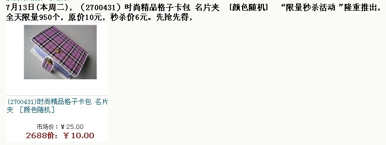 7月13日(本周二),(2700431)时尚精品格子卡包 名片夹 〔颜色随机〕 “限量秒杀活动”隆重推出,全天限量950个,原价10元,秒杀价6元。先抢先得!