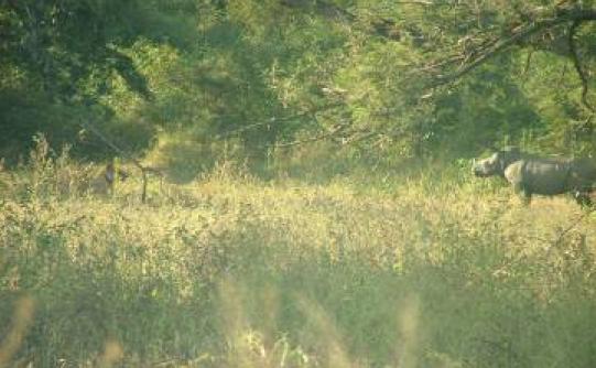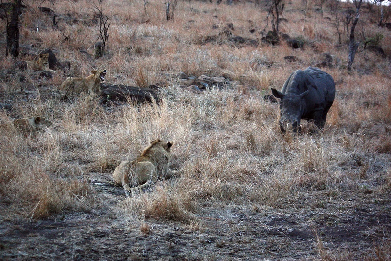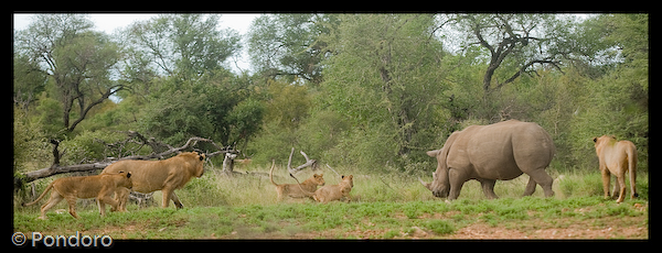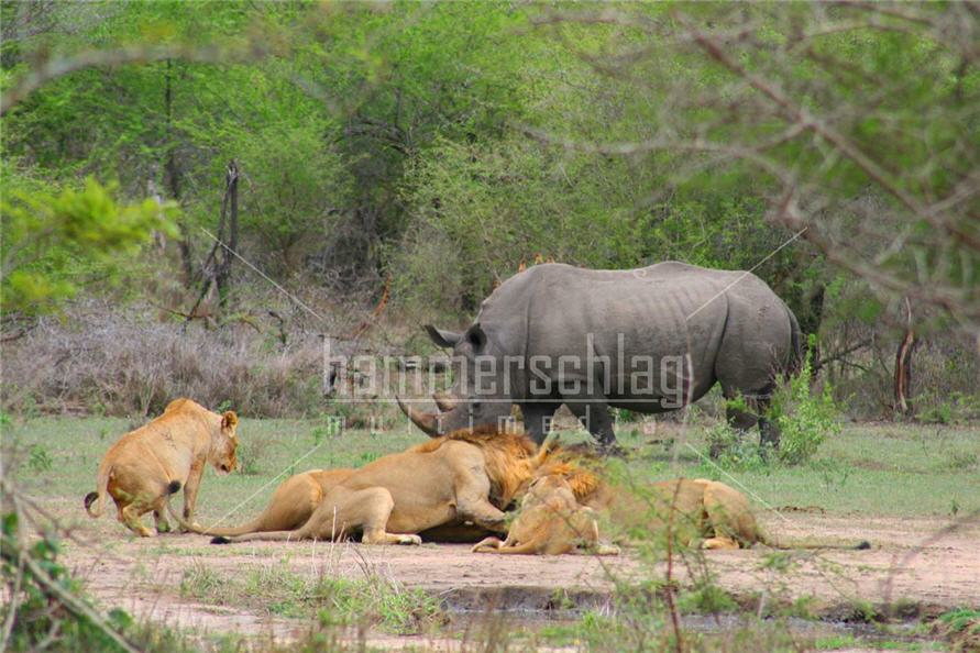 这头犀牛被一群狮子包围但似乎依然很从容淡定啊。