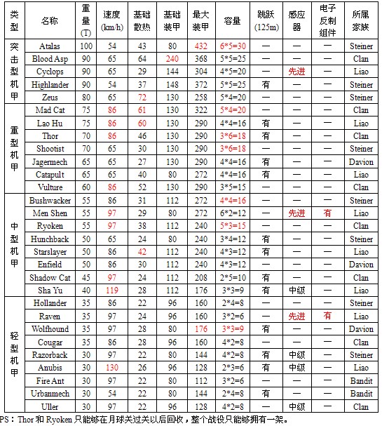 备注:红色是表示该性能参数在对应此类机甲中效果突出。
