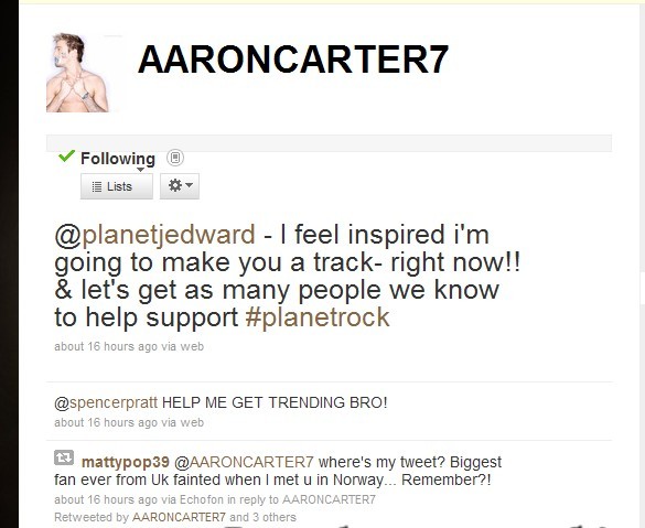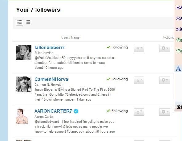 我本来是follow justinbieber的,后来有他的一群粉丝加我了,我在当中看见个男的(他不是粉丝),再往后面一看还有个蓝色的对勾,在twitter上凡是有蓝对勾的大多数是名人,我点开一看他叫AARONCATER7用户名是这样的,里面写什么感谢粉丝之类的,可惜的是我不知道他,就暂时follow了,呵呵,所以来贴吧看看他是怎样的人