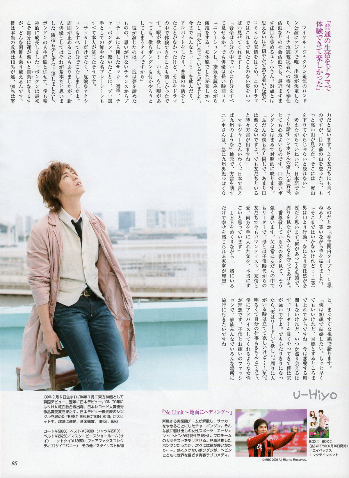 顺便说一下,允浩现在最迷的是饮食。“去拉斯维加斯排练迈克杰克逊的追悼会时,迷上了印度料理。还有现在韩国流行的动物内脏的火锅跟鸡翅尖肉等等。比起向别人打听,我更喜欢自己到处走走吃吃,发现以后可能会变得很有人气的店后介绍给朋友。(笑)”