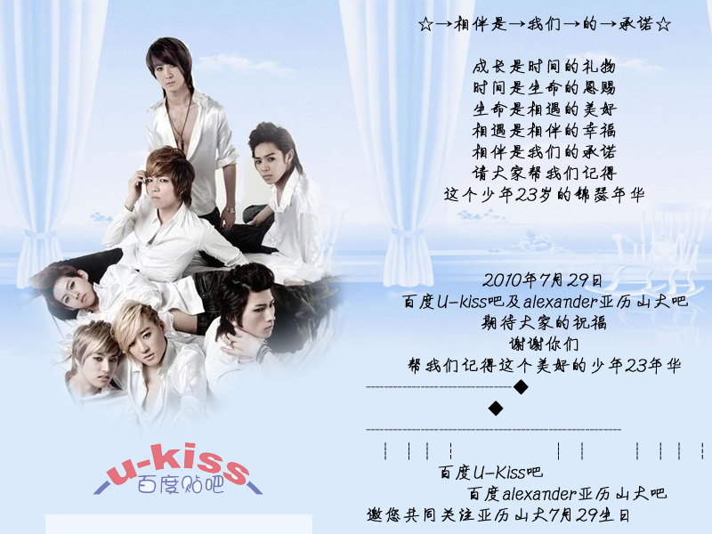 百度U-kiss吧及alexander亚历山大吧全体Kiss me邀您共庆亚历山大7月29日23岁生日