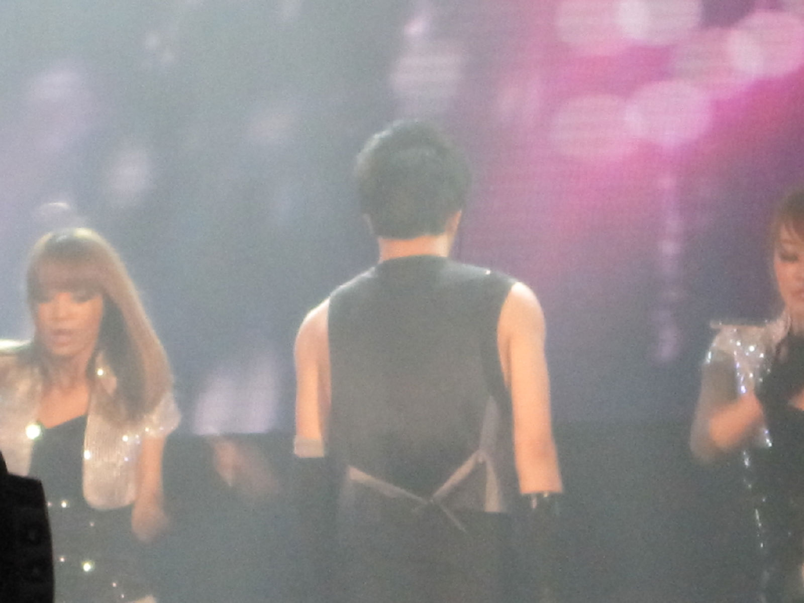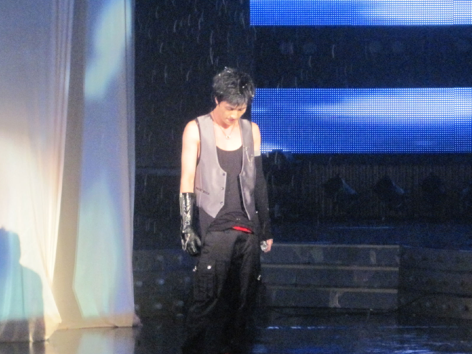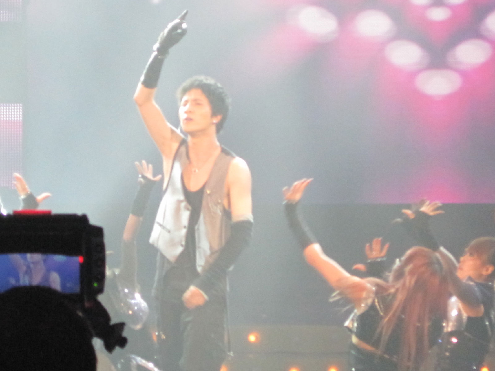 那个黑手套。。。薛刚出来看李晨的那个点头游戏的时候。我们很大声的叫他。他跟我们招手的时候,就看到了。。。呵呵。那就一定唱雅典娜了。。。