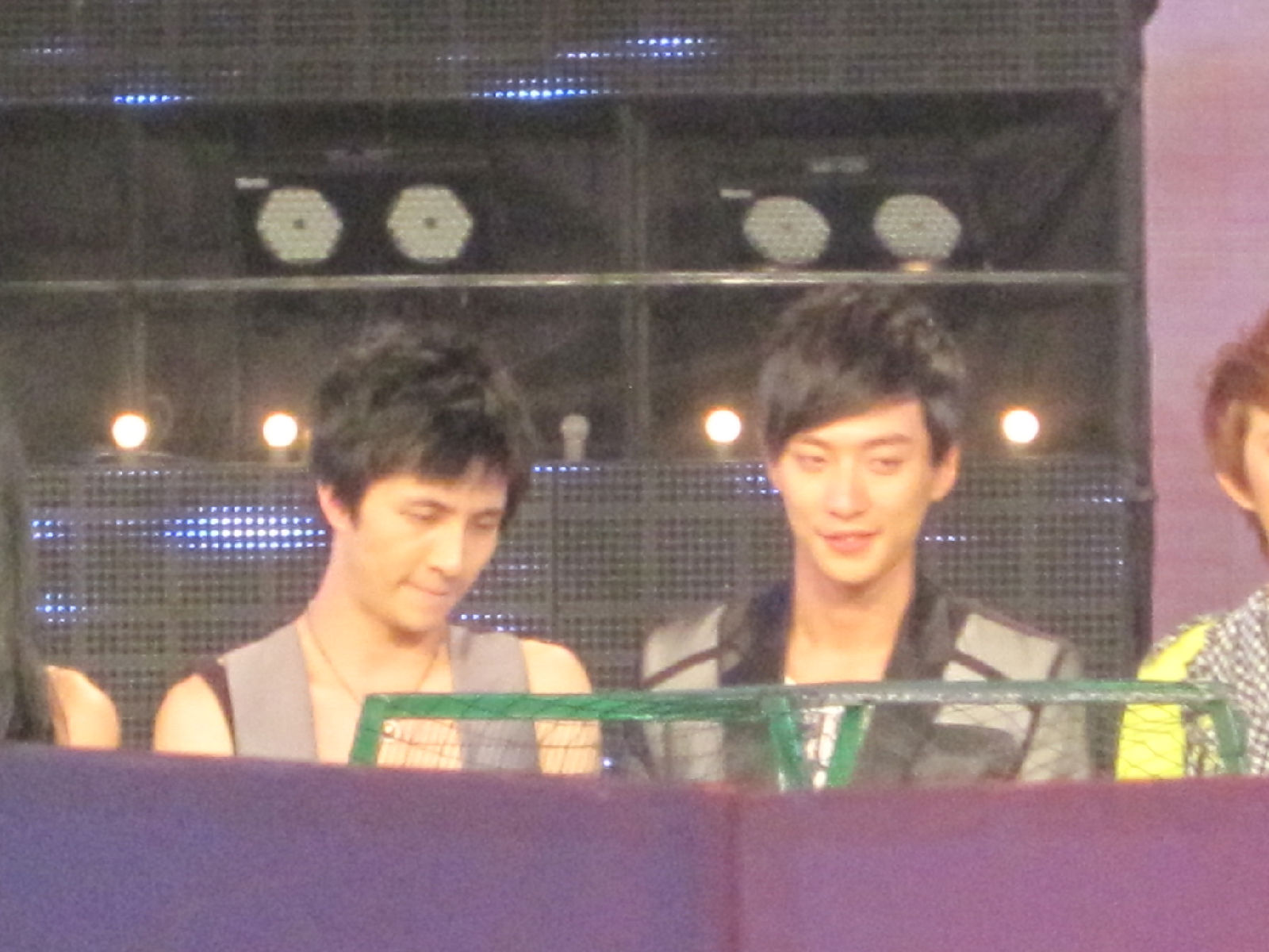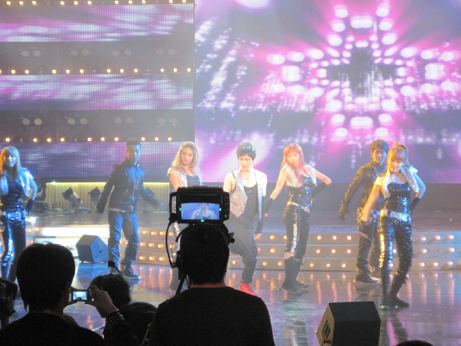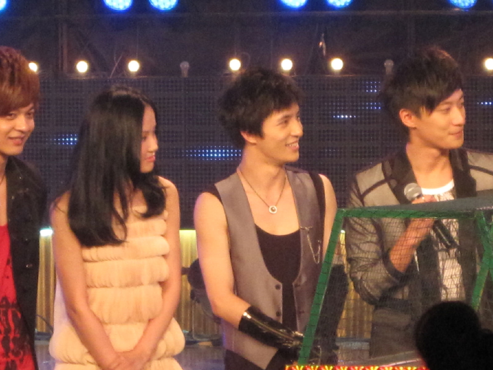 那个黑手套。。。薛刚出来看李晨的那个点头游戏的时候。我们很大声的叫他。他跟我们招手的时候,就看到了。。。呵呵。那就一定唱雅典娜了。。。