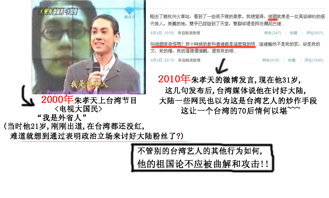 一个是10年前他上节目时的视频截图(地址:tieba.baidu.com/%E6%9C%B1%E5%AD%9D%E5%A4%A9/shipin/play/05c5e9f11d2a3117b41f026e)