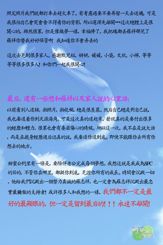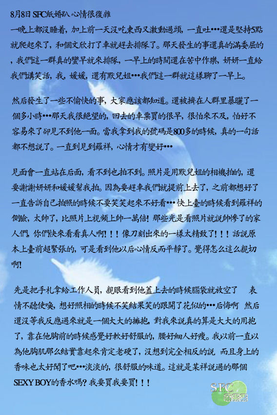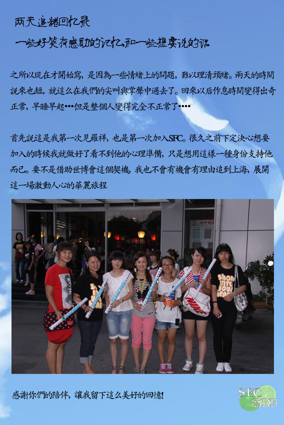 首先说这是我第一次见罗祥,也是第一次加入SFC。很久之前下定决心想要加入的时候我就做好了看不到他的心理准备,只是想用这样一种身份支持他而已。要不是借助世博会这个契机,我也不会有机会有理由追到上海,展开这一场激动人心的华丽旅程~