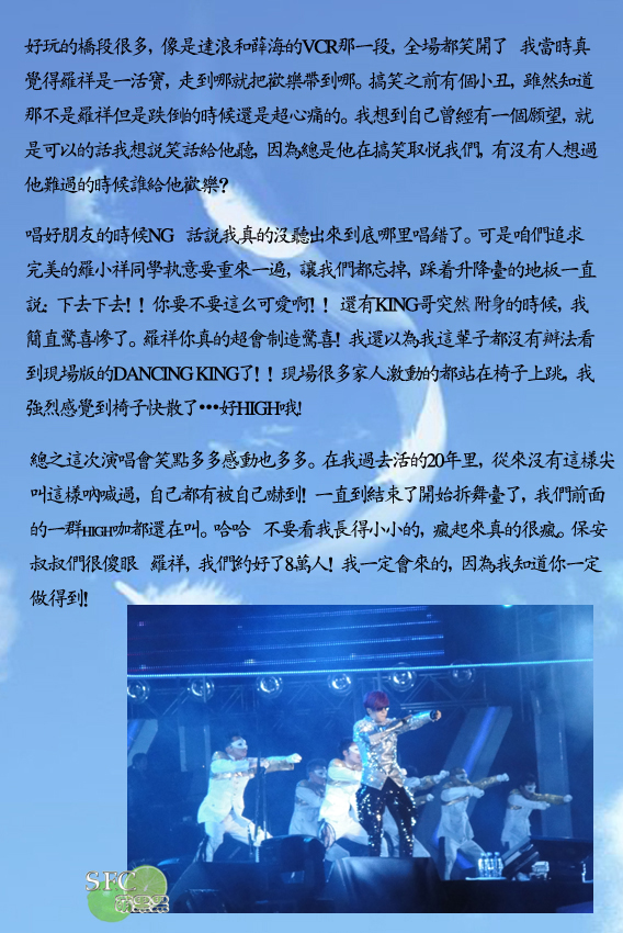 唱好朋友的时候NG~话说我真的没听出来到底哪里唱错了。可是咱们追求完美的罗小祥同学执意要重来一遍,让我们都忘掉,踩着升降台的地板一直说:下去下去!!你要不要这么可爱啊!! 还有KING哥突然附身的时候,我简直惊喜惨了。罗祥你真的超会制造惊喜!我还以为我这辈子都没有办法看到现场版的DANCING KING了!!现场很多家人激动的都站在椅子上跳,我强烈感觉到椅子快散了•••好HIGH哦~~~