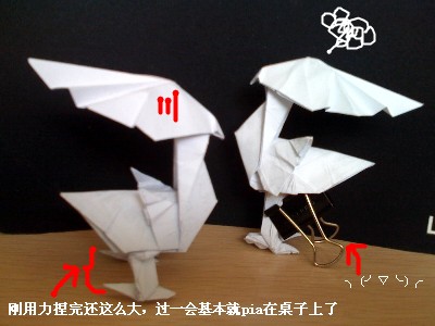 用A4打印纸折的陆行鸟,于是大腿那里就折的很厚(自认为是压不动了),并不上,于是很悲哀的就有点残疾,反正就劈腿了,只能在屁屁的地方用别针别上了,是折的问题,还是纸的问题呢??大家都咋处理的呢???