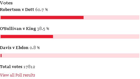 啊……有点晕……第11楼被抽掉了…… 疯了!!!! 咕咚……在首轮……就……倒下了…… 全篇报道也很长,有一段是说咕咚的 Former World Champion Graeme Dott suffered a surprise 4-3 defeat against Wiltshire's Adam Wicheard. Dott also missed the chance of a 147 in the third frame, failing on the 14th red on 104. 意思是咕咚经过了一番苦战最终3:4输给了那个……小忆叫不出来名字的家伙(一开始看错了,还以为是4:3险胜呢),而且咕咚在第三局还错失了147,在打第14颗红球的时候出现了失误,只得到了104分…… 啊……这样很伤士气啊……咕咚是不是在后面几局情绪受影响了啊? 看来……短局制……确实……不太适合咕咚啊…… 孩子啊,没事儿,没事儿,排名掉不出前16的,挺好,挺好,在自己不擅长的比赛中打到这样已经很好了~~先回家休养休养,然后在保罗亨特赛和上海大师赛还有格拉斯哥赛好好表现~~