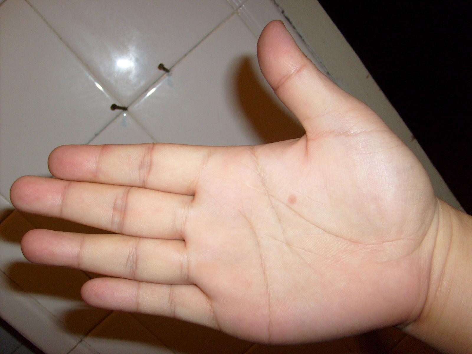 本人将来多注意心血管方面的疾病(父母一方有这方面的疾病遗传),生命线入地丘开叉,(注意妇科方面)。右手生命线上方粉红色痣,颜色好,得夫缘,不宜早婚,也说明性欲旺盛。(27岁前结婚有不顺)(57岁后生命中有一次大病或意外,看不清流年)中间阶段相当旺盛