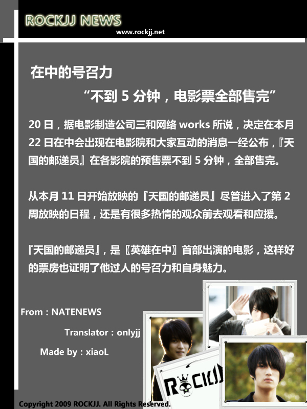 20日,据电影制造公司三和网络works所说,决定在本月22日在中会出现在电影院和大家互动的消息一经公布,『天国的邮递员』在各影院的预售票不到5分钟,全部售完。