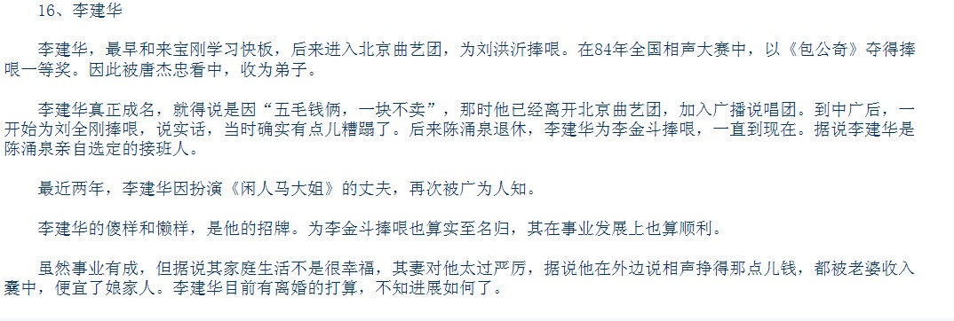 李建华真正成名,就得说是因“五毛钱俩,一块不卖”,那时他已经离开北京曲艺团,加入广播说唱团。到中广后,一开始为刘全刚捧哏,说实话,当时确实有点儿糟蹋了。后来陈涌泉退休,李建华为李金斗捧哏,一直到现在。据说李建华是陈涌泉亲自选定的接班人。