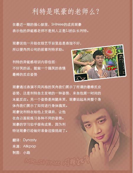在最近一期的强心脏里,SHINee的成员珉豪表示他的异能感老师不是别人正是SJ的队长利特。