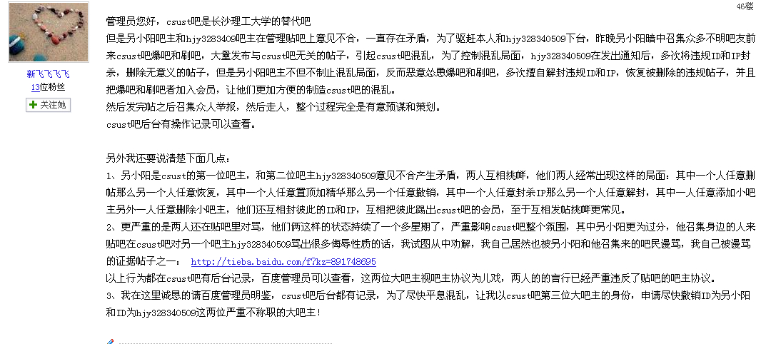 同时我也解释一下新飞飞飞飞的情况,管理员是说“以往存在发言ip相同情况”注意是“以往”,我曾经用过“新飞飞飞飞”的ID发言过,其实我也曾经用过另小阳的ID发言过,因为不仅仅是新飞飞飞飞,另小阳他也曾经把他账号的密码给过我。