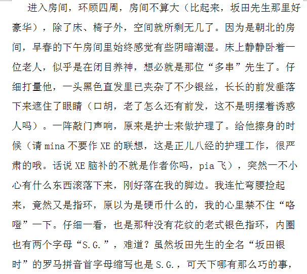 “说起这位老先生,感觉他挺可怜的。听说是从北方来的,没有一个亲人,而且条件也不像坂田先生那么好,住得起高级房间。不过,我可没有你那么辛苦,又要推轮椅出去散步,又要听他讲那过去的事情(为毛总觉得这句话那么喜感)。我就是每次去给他读读书就好了,余下的时间就可以在院子里练羽毛球。说起来环境还真是好啊(山崎你也太不敬业了吧)。”说到这里,山崎不由自主地竟有几分得意。