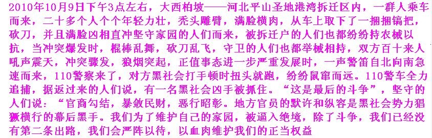 我是河北省平山县一名普通教师,叫贾永博。 由于对协议条款约定的不明白,不准确,我一直拒签,导致我的生命财产居住环境受到最严重的破坏和干扰,我难以聊生,痛苦不堪,惶惶终日,度日如年。