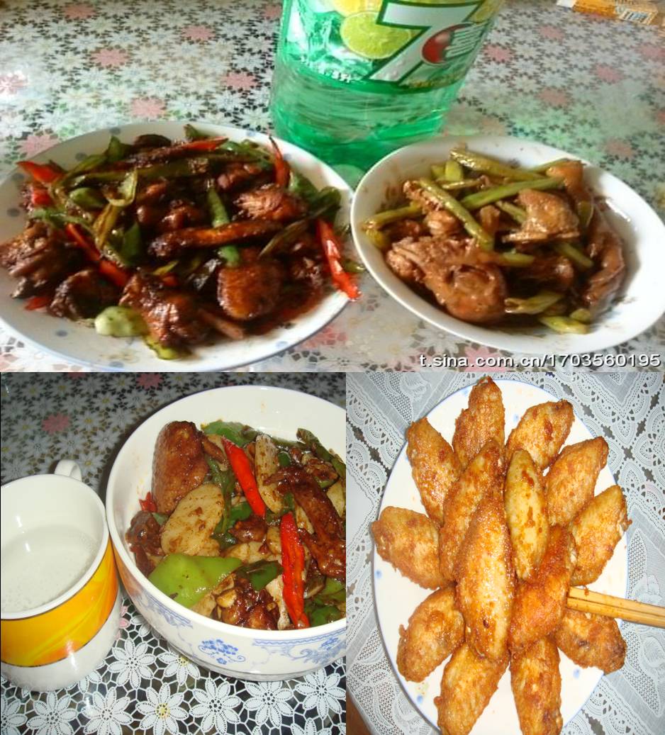 已出品:青椒炒鸡(第1天)、梅豆角烧鸡(第2天)、年糕青椒鸡(第3天)、煎炸翅中翅(第4天)